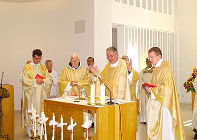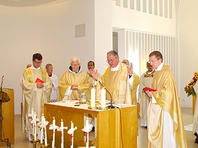 Landes-Caritasdirektor Dr. Andreas Magg, der vor rund 20 Jahren als Seelsorger in Ursberg aktiv war und eine besonders herzliche Beziehung zum Kloster und zum DRW hat, zelebrierte den Festgottesdienst zusammen mit weiteren Geistlichen und hielt auch die Predigt, in der er sich auf die Lesung aus dem Buch Nehemia bezog, in dem berichtet wird, wie das Volk Israel aus dem babylonischen Exil zurückkehrt. Magg: „Liebe Schwestern! Auch Ihr Weg ist ein Lebensweg in Gemeinschaft, ein Reifungsweg.“ Dabei machte Magg deutlich, wie stark die Schwestern mit ihrer Grundhaltung, aus dem gemeinsamen Glauben heraus den Betreuten ein menschenwürdiges Leben zu ermöglichen, das Evangelium verkündet haben: „Ich bin überzeugt, dass die Frohe Botschaft nicht abgeschlossen ist, sondern in unserem Leben fortgeschrieben wird.“ Er betonte: „Ihr Leben ist eine heilige Schrift. Sie geben Zeugnis für unseren Gott!“ und fügte ein Zitat von Papst Benedikt XVI. an: „Der Weg zu Gott führt immer über den Menschen.“
